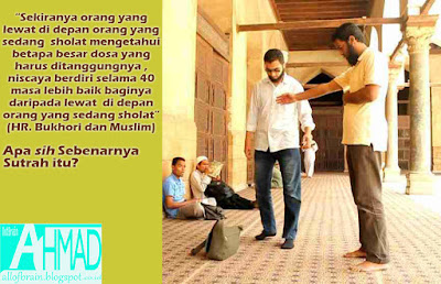 "Hendaknya seseorang dari kalian membuat sutrah sewaktu mengerjakan sholat, meskipun dengan anak panah"(HR. Hakim,Thabrani, dan Ahmad)